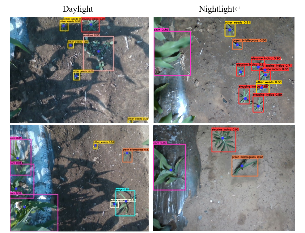 针对以上问题,本研究研发了一种准确高效的杂草抑制方法,为田间精准除草机器人的杂草识别系统提供技术支持。本研究首先针对田间存在的玉米苗与杂草之间相互遮挡、自然光线变化和杂草生长分布不均、设备资源有限等问题,构建了SRD-YOLO网络模型以实现玉米田间各类杂草的正确分类和各类杂草生长点的准确定位。其次,精准除草机器人根据获得的杂草生长点的位置信息对生长点进行精准打进,以实现高效的杂草抑制。